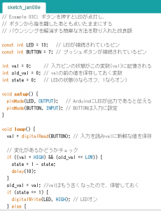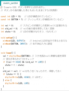 次は“ボタンを押すとLEDが点灯し、ボタンから指を離しても点いたままにする”というのを作りました。